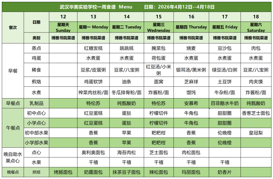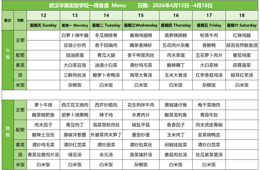 营养膳食| 武汉华美学校一周食谱(:2026年04月05日--04月11日)